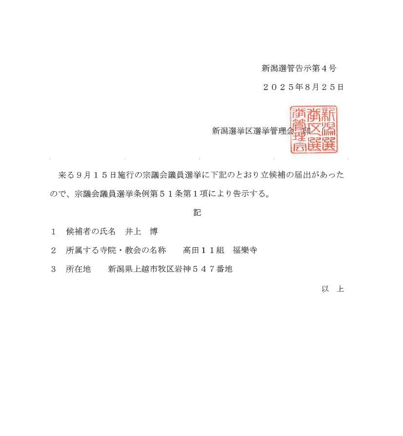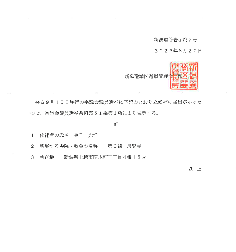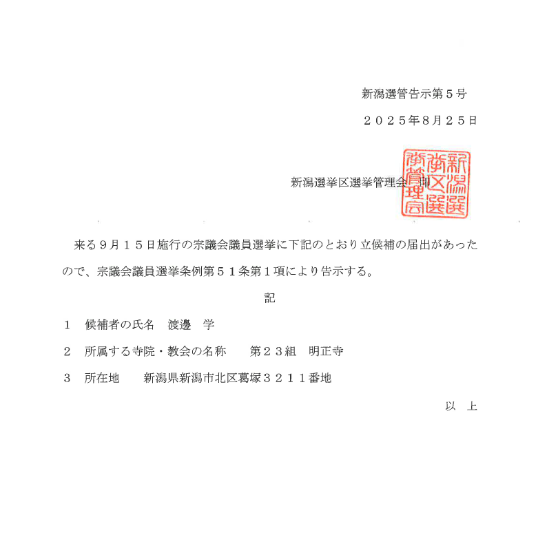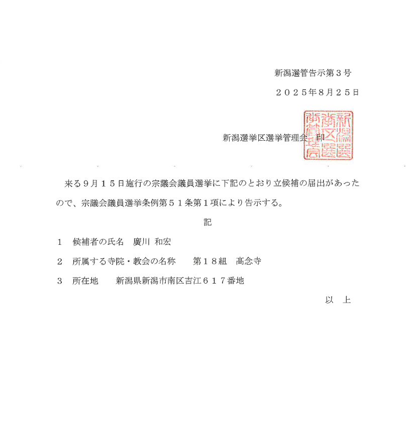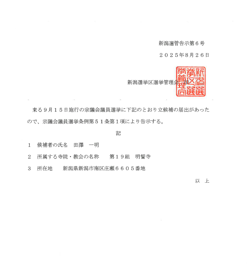 このたび、9月15日施行の宗議会議員選挙につきまして、下記のとおり立候補の届出がありましたため、宗議会議員選挙条例第51条第1項により告示をいたしましたのでご承知おきください。