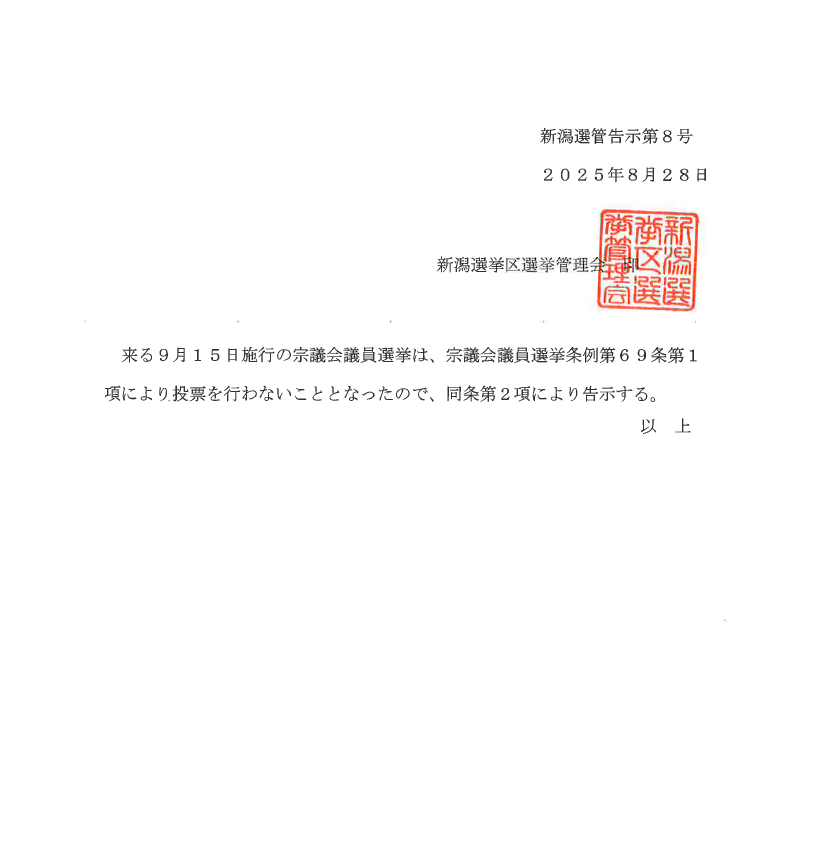 来る9月15日施行の宗議会議員選挙は、宗議会議員選挙条例第69条第1項により投票を行わないこととなりましたので、お知らせいたします。