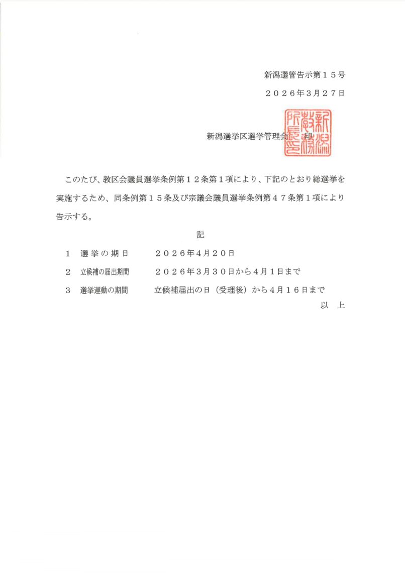 このたび、教区会議員選挙条例第12条第1項により、総選挙を実施するため、同条例第15条及び宗議会議員選挙条例第47条第1項により告示がなされましたのでご承知おきください。
