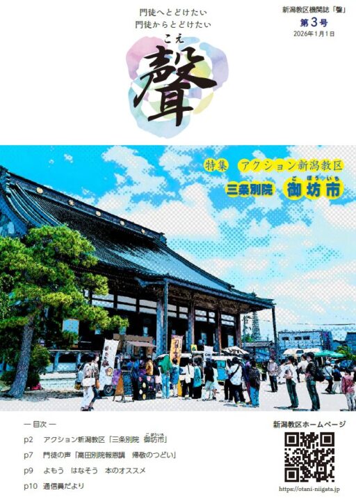 教区内のご門徒に向けた、新潟教区が発行する機関誌「聲」。その名の通り、僧侶・ご門徒の「声」を聴き、その「声」をお届けすることを主眼とし、行事の感想や教義への疑問などを取材したものを記事にしています。この機関誌を通して、お寺とご門徒の縁を繋ぐ一助となることを願いとしています。(年2回発行/各4,000部)